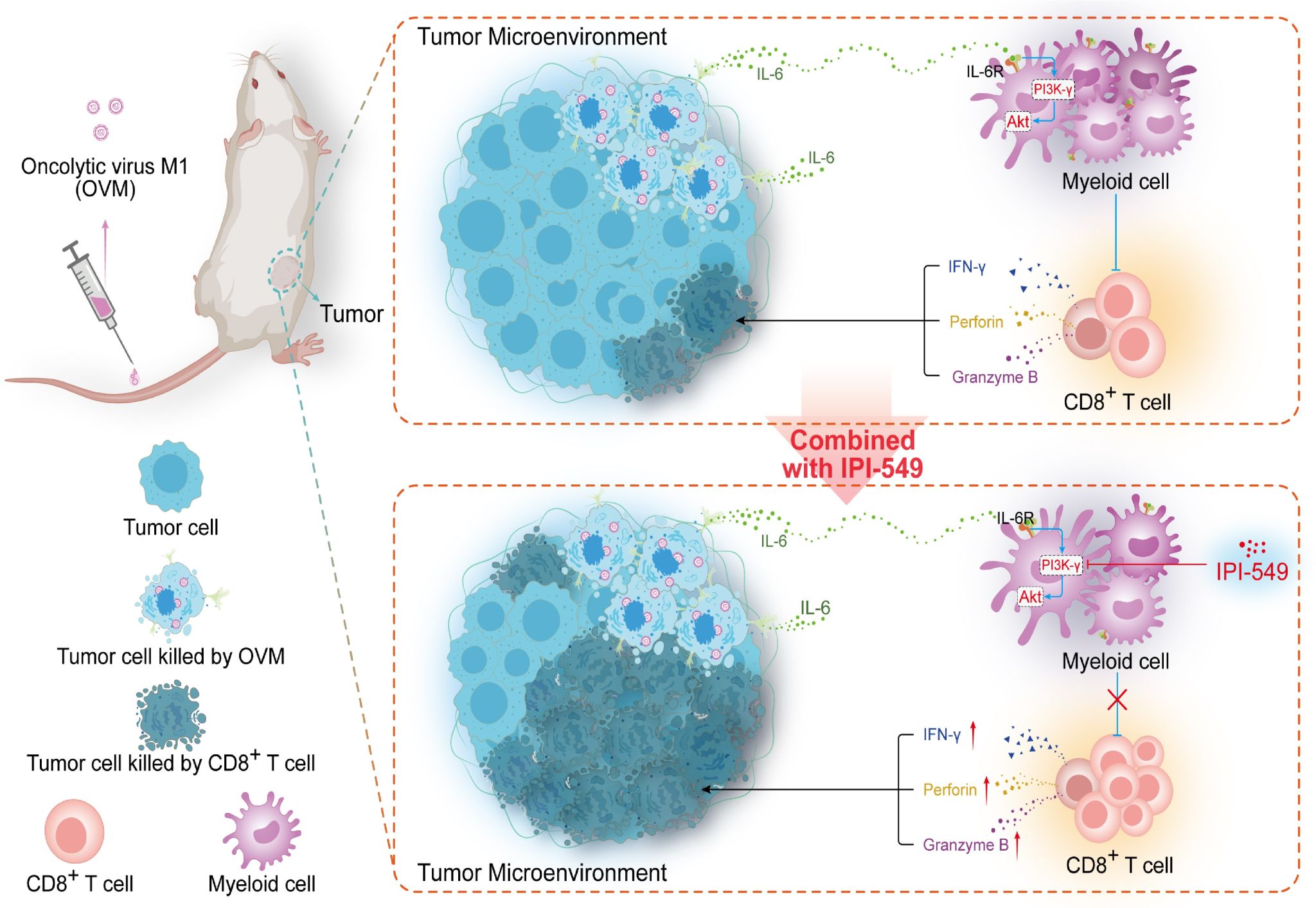 迄今為止,任何一種癌癥治療藥物或早或晚都會產生抗藥性,顏光美教授團隊前瞻性地開展了未來可能對OVM產生抗藥性的機理和方法。在本項研究中,研究團隊首先確證了部分體外對OVM高度敏感的腫瘤細胞株在體內卻抵抗 OVM 治療。進一步的研究發現,腫瘤微環境中的髓系細胞(即腫瘤相關髓系細胞TAMCs)是限制OVM療效的免疫抑制因素,且刪除髓系細胞能大幅提高OVM的療效。有趣的是,在對OVM治療敏感和抵抗的腫瘤模型中,OVM處理均上調TAMCs的浸潤,且OVM處理加劇了TAMCs的免疫抑制表型。轉錄組測序和驗證性實驗證實,OVM誘導腫瘤細胞分泌細胞因子IL-6,IL-6激活TAMCs中的PI3K-γ(該PI3K亞型僅存在于髓系細胞中)信號,進一步促進TAMCs遷移至腫瘤部位并加劇TAMCs對細胞毒性CD8+T淋巴細胞的抑制作用。在多種難治性惡性腫瘤模型中,靶向抑制PI3K-γ減少腫瘤浸潤髓系細胞的比例,扭轉其免疫抑制表型,進而顯著增強OVM的療效。進一步地,OVM聯合 PI3K-γ抑制劑和免疫檢查點阻斷能治愈33.3%的三陰乳腺癌、83.3%的結直腸癌和62.5%的胰腺癌。在胰腺癌治愈鼠中再次接種10倍于初次接種細胞數量的胰腺癌細胞,腫瘤不能生長,說明治愈鼠出現了抗腫瘤免疫記憶。綜上所述,該研究鑒定了腫瘤微環境中限制OVM 療效的免疫抑制細胞和分子機制,并提供了通過解除髓系免疫抑制強化OVM溶瘤效應的多種用藥策略,為解決溶瘤病毒研究領域中抵抗性和療效限制這一共性問題提供了研究范式。