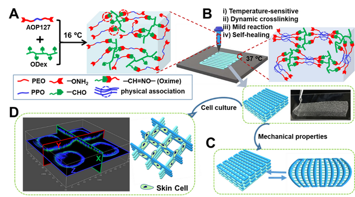 圖4 溫度敏感水凝膠直接擠壓式3D打印示意圖。(A)低溫(16℃)下水凝膠中動態肟鍵交聯示意圖;(B)3D打印過程及在生理溫度(37℃)下疏水相互作用二次交聯;(C)3D打印支架的韌性;(D)細胞在3D打印支架中的三維分布。
