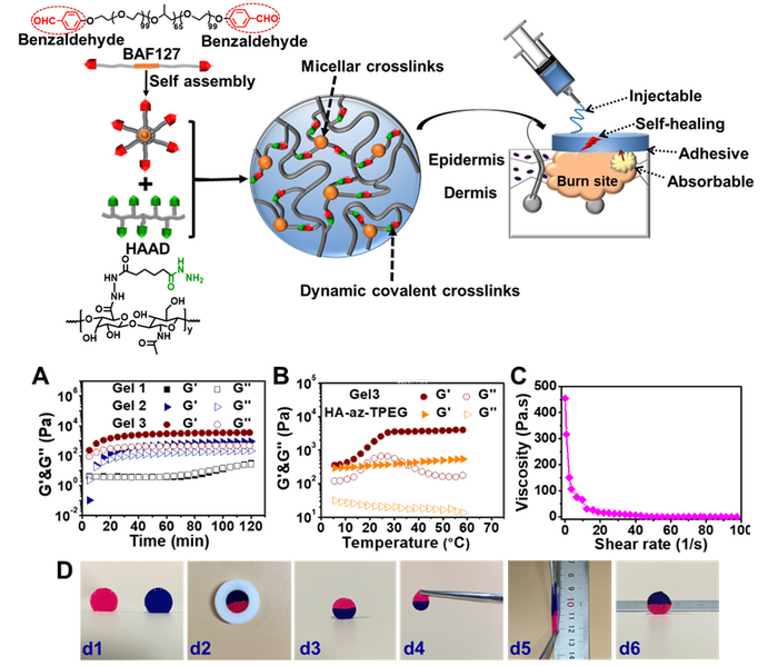 團隊利用了動態共價交聯和自組裝物理交聯的優點構建了智能雙網絡水凝膠,應用于燒傷護理敷料方面。基于酰肼修飾的透明質酸和端基苯甲醛修飾的Pluronic F127之間形成動態酰腙鍵,而F127可在溫和溫度(>25°C)形成疏水物理交聯。物理交聯可為水凝膠貢獻剪切變薄、溫敏性和能量耗散的性質,動態化學和物理雙交聯可提供優異的粘彈性和自愈合(圖2)。深度局部燒傷治療結果表明,該水凝膠具有良好的滲出物吸收和良好的細胞相容性,可促進大鼠皮膚燒傷創面愈合。值得注意的是,此水凝膠通過游離的醛基可與組織上的氨基化學結合表現出組織粘合性,可望解決常規水凝膠敷料易從生理組織脫落的難題。該材料有望作為一種新型多功能水凝膠基燒傷皮膚敷料。該工作以題為“A Hydrogel Crosslinked with Dynamic Covalent Bonding and Micellization for Promoting Burn Wound Healing”發表在 ACS Applied Materials & Interfaces(?2018, 10, 25194),論文鏈接:https://doi.org/10.1021/acsami.8b08165。