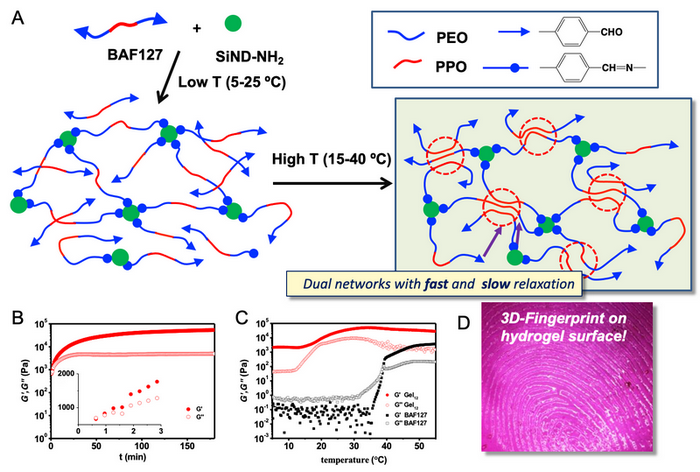 圖1 (A)溫度敏感的動態化學與物理雙網絡凝膠結構示意;(B)25℃時水凝膠的儲能模量和損耗模量;(C)溫度變化對水凝膠儲能模量和損耗模量的影響;(D)指紋三維紋路可滯留在水凝膠表面。