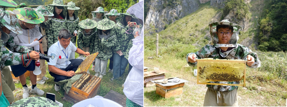 鑒于世界自然遺產地保護對很多當地居民的傳統生計方式(如放牧)有一定程度的限制,幫助當地百姓養蜂或者參與研學旅游成為可能的生計選擇之一。為了更好地了解養蜂這種當地社區居民的生計方式,營員實地考察臥龍養蜂基地。在鄧生溝保護站巡護員何濤老師的帶領下,營員們學習了解了中華蜜蜂的特點、蜜蜂的分工與習性、蜂箱的結構。同學們體驗了蜂蜜制作全過程,就蜜蜂采蜜時間、養蜂過程中的困難等話題積極提問。這一過程中,營員感受到自然保護地生態系統的魅力,也逐漸認識到養蜂在平衡遺產保護與傳統生計維持中的作用。