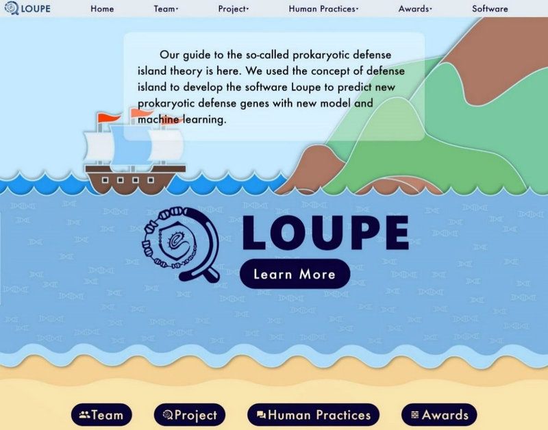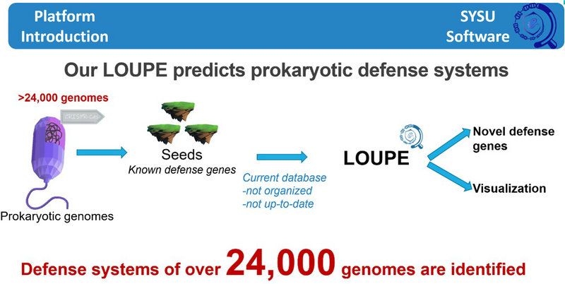 中山大學軟件隊(SYSU-Software)成員包括來自生命科學學院的李鍶鐸、王元瑾、陳佳芃、程一諾、馮瑜輝、李慧彬、李凱、童馨潔、伍周穎、張藹銘,計算機學院的黃靖云、王童、許鴻鑫、許遵楠、楊天行、鄭中淳,數學學院的龔立言,傳播與設計學院的簡子喬,生態學院的徐微,環境科學與工程學院的李心妍、邱文君等,不同學科背景的同學聚在一起激起創新思維的火花。在生命科學學院楊建華教授等老師的指導下,團隊閱讀大量文獻,走訪不同實驗室,抓住尋找原核生物新型的抗病毒基因的學術前沿話題,充分運用合成生物學的思維方式和研究手段,結合大數據、人工智能算法和機器學習等開發出原核生物抗性系統搜索及預測平臺“LOUPE”(http://sysu-software.com),主要目標是從巨大的微生物基因組中發現新的防御系統及防御基因。應用“LOUPE”軟件于大規模的微生物基因組數據中,挖掘出大批新的防御基因,最后利用濕實驗初步驗證了這些基因的潛在防御功能。該項目為研究者尋找潛在基因編輯工具和理解噬菌體-宿主相互競爭機制提供了新的方法。