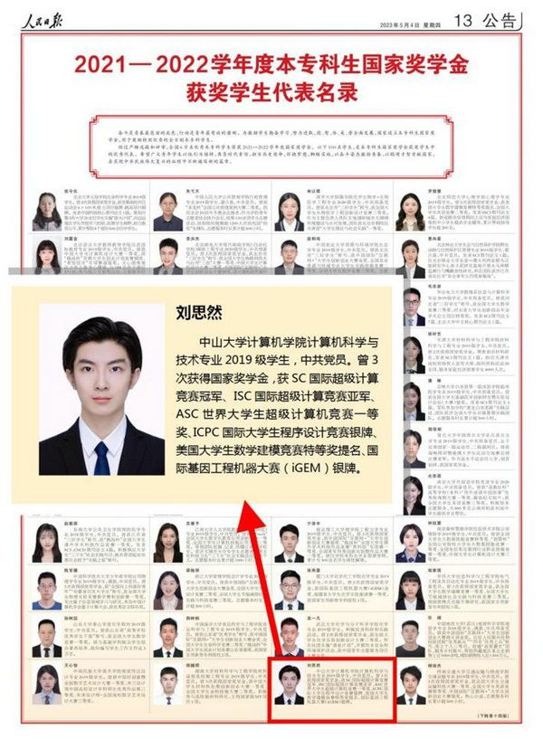 中大新聞網廣州5月6日電(通訊員林儀)5月4日,人民日報發布《2021—2022學年度本專科生國家獎學金獲獎學生代表名錄》(以下簡稱《名錄》),我校劉思然同學名列其中。