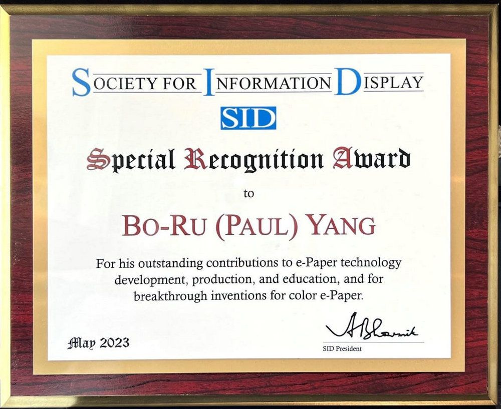 中大新聞網訊(通訊員林銳娜)5月23日,在國際信息顯示學會(Society for Information Display,簡稱“SID”)年會上,SID總部為中山大學電子與信息工程學院楊柏儒教授頒發2023年度特殊貢獻獎(Special Recognition Awards),表彰他為電子紙技術的開發技術、產品化和科普教育,尤其在彩色電子紙技術領域所做出的杰出貢獻。