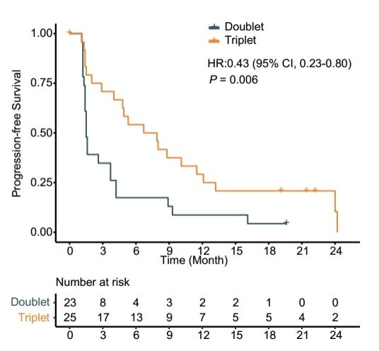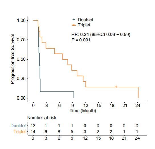 圖1. 兩藥組與三藥組的無進展生存時間曲線