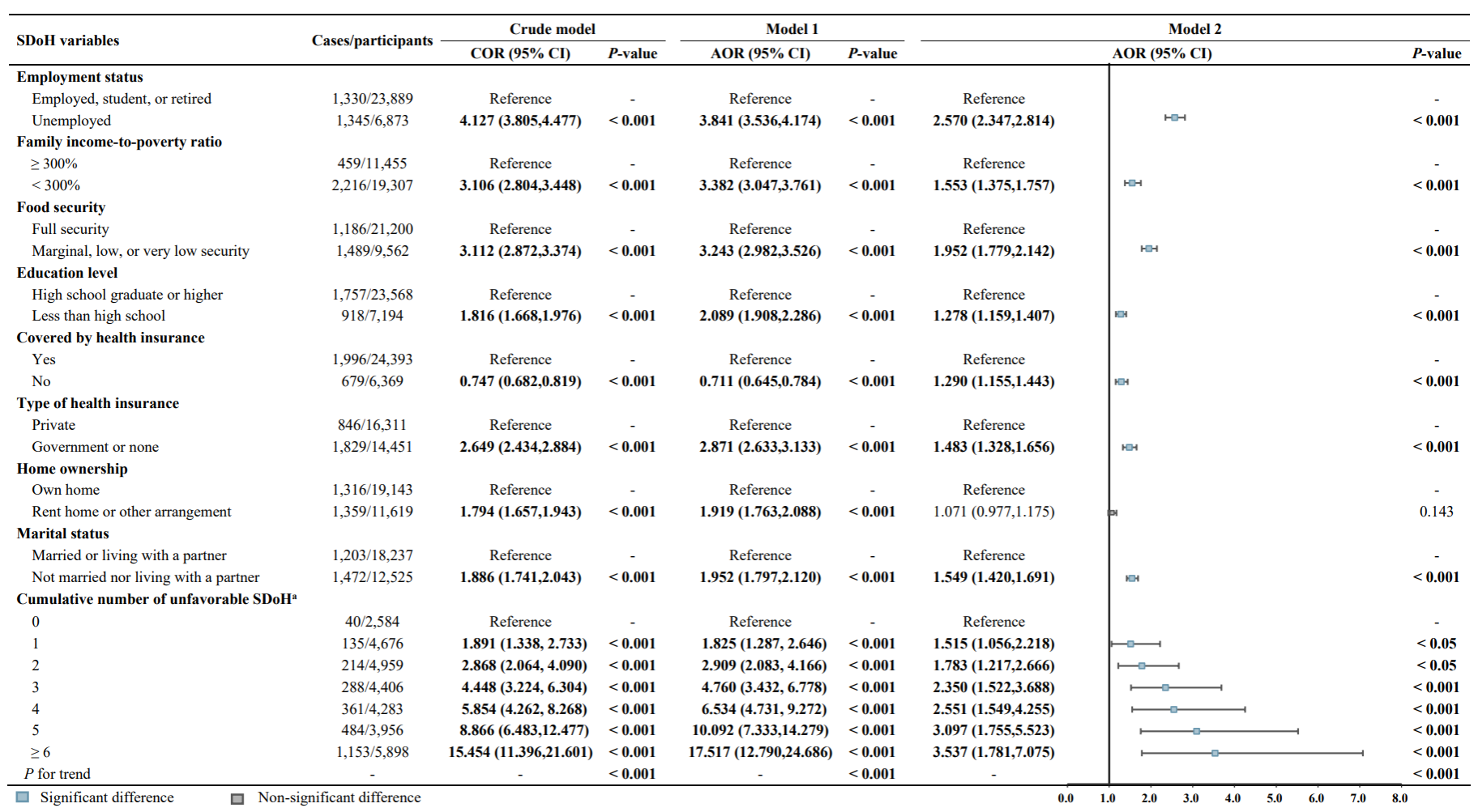 研究發現(表1),經歷各種不利的SDoH的個體更易罹患抑郁癥狀,這些因素包括失業、較低家庭收入、糧食不安全、高中以下學歷、無健康保險覆蓋或無私人健康保險、未婚或獨居。而且,隨個體經歷的不利SDoH數量增加,SDoH與抑郁癥狀關聯的AOR值上升(Ptrend < 0.001)。該研究發現與累積不平等理論一致,社會相關因素可能決定著健康資源的獲取,缺乏相關資源或處于不利環境的人群可能遭遇更多的健康負面影響,而資源更多的人群則從中獲益,使得健康不平等持續存在。這些發現加強了對抑郁癥狀的社會相關風險因素的認識,強調解決抑郁癥狀相關SDoH在減少心理健康差異中的重要性,提示在公共衛生政策制定時需兼顧個體因素和社會不平等因素,從而促進健康公平性、提高人類整體福祉。