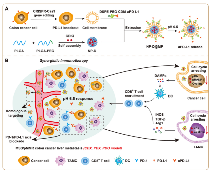 針對(duì)結(jié)腸癌肝轉(zhuǎn)移瘤的免疫抑制微環(huán)境,研究團(tuán)隊(duì)利用CRISPR-Cas9技術(shù)敲除腫瘤細(xì)胞膜表面PD-L1蛋白,提取細(xì)胞膜囊泡,并用其制備工程細(xì)胞細(xì)胞膜修飾的仿生納米藥物,共同遞送細(xì)胞周期蛋白依賴性激酶1/2/5/9抑制劑(CDKi)和PD-L1抗體。該納米藥物通過工程化細(xì)胞膜(CCM)介導(dǎo)的腫瘤同源靶向和PD-L1抗體介導(dǎo)的主動(dòng)靶向?qū)崿F(xiàn)肝轉(zhuǎn)移瘤的精準(zhǔn)遞送,靶向腫瘤微環(huán)境中的癌細(xì)胞及腫瘤相關(guān)髓系細(xì)胞(TAMC),捕獲G2/M細(xì)胞周期,誘導(dǎo)癌細(xì)胞免疫原性死亡,促進(jìn)CD8+ T細(xì)胞浸潤(rùn),將“冷”腫瘤轉(zhuǎn)變?yōu)椤盁帷蹦[瘤;同時(shí),抑制TAMC,逆轉(zhuǎn)免疫抑制微環(huán)境,增敏MSS/pMMR結(jié)腸癌肝轉(zhuǎn)移的ICB治療效果。該靶向治療體系在結(jié)腸癌肝轉(zhuǎn)移(PDX)模型及人源類器官模型中具有同樣的協(xié)同免疫治療效果。