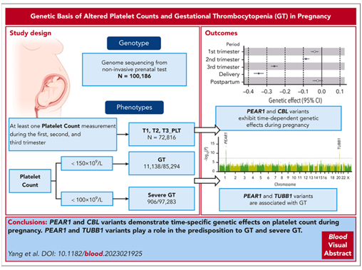 中大新聞網(wǎng)訊(通訊員劉斯洋)妊娠期是人類(lèi)繁衍的關(guān)鍵時(shí)期。婦女在孕期會(huì)發(fā)生一系列生理變化以支持胎兒的生長(zhǎng)和發(fā)育。其中,孕婦的血小板計(jì)數(shù)會(huì)逐漸下降,分娩時(shí)達(dá)到最低值,產(chǎn)后逐漸恢復(fù)至孕前水平。妊娠期血小板減少癥(GT)是妊娠期常見(jiàn)的一種血液系統(tǒng)疾病, 表現(xiàn)為血小板計(jì)數(shù)小于150×109/L。全球每年有超過(guò)900萬(wàn)的GT患者。GT患者產(chǎn)后大出血的風(fēng)險(xiǎn)分別是正常孕婦的2-3.7倍。血小板計(jì)數(shù)是一個(gè)高度可遺傳的表型,在不同人群中估計(jì)其遺傳力為0.45-0.54。臨床上觀察到GT患者再次妊娠時(shí)復(fù)發(fā)的風(fēng)險(xiǎn)比是正常孕婦的14.2倍。這提示了遺傳因素在妊娠期對(duì)血小板計(jì)數(shù)的變化和GT的發(fā)病可能具有重要作用。然而,由于足夠功效的遺傳學(xué)研究設(shè)計(jì)仍存在資金、物流和方法等方面的挑戰(zhàn),迄今為止尚無(wú)研究對(duì)妊娠期血小板計(jì)數(shù)和GT的遺傳基礎(chǔ)進(jìn)行深入探討。