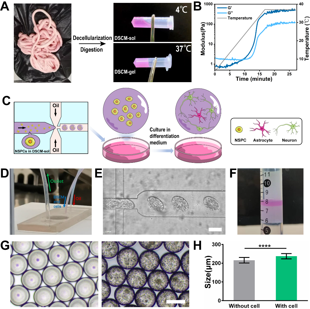 針對脊髓損傷細胞移植療法中的痛點問題,材料科學與工程學院白瑩副教授團隊提出了一種利用天然脊髓組織來源的脫細胞基質微凝膠作為神經干/祖細胞(Neural stem/progenitor cells, NSPCs)移植載體,通過體外預分化和微創原位注射方式對嚴重的脊髓挫傷疾病模型進行細胞治療。由于該脫細胞基質微凝膠具有脊髓組織特異性的生物活性,可在體外促進NSPCs向神經元分化,并在移植后通過改善脊髓損傷微環境募集內源性干細胞,實現細胞移植療法與內源性修復再生的協同作用。這種原位細胞治療方法成功提高了移植NSPCs用于脊髓損傷治療的術后效果,具有極強的臨床轉化潛力。