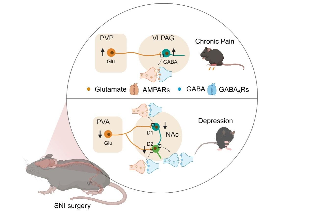 研究團隊證實了在PVT后區(qū)(PVP),谷氨酸能神經(jīng)元(PVPGlu)向腹外側(cè)導(dǎo)水管周圍灰質(zhì)(VLPAG)的GABA能神經(jīng)元(VLPAGGABA)發(fā)送信號,介導(dǎo)共病中的疼痛行為。同時,在PVT前區(qū)(PVA),谷氨酸能神經(jīng)元(PVAGlu)向伏隔核D1陽性神經(jīng)元和D2陽性神經(jīng)元(NAcD1→D2)發(fā)送信號,參與共病中的抑郁樣行為。本研究表明,不同的丘腦-皮質(zhì)下回路PVPGlu→VLPAGGABA和PVAGlu→NAcD1→D2分別介導(dǎo)了SNI后的疼痛行為和抑郁樣行為,為理解和治療慢痛抑郁共病提供了基于神經(jīng)環(huán)路的潛在思路和靶點。