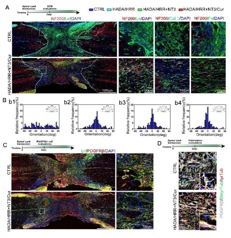 在正常組織中,細胞外基質(extracellular matrix,ECM)為細胞的生存及活動提供適宜的場所,但脊髓損傷后ECM過度沉積形成纖維瘢痕,成為軸突再生的物理屏障。該團隊發現,HADA/HRR水凝膠逆轉了脊髓損傷后纖維化過程,獲得平行排列的結構引導再生軸突生長,而非無規分布的致密瘢痕。進一步研究發現,PDGFRβ+細胞(脊髓損傷后纖維瘢痕主要形成細胞)在HADA/HRR水凝膠干預組呈平行排序方式向水凝膠遷移,而非無干預組的無規遷移。緩釋NT3和Cur后能夠進一步增強ECM重塑效果(圖2)。這提示,HADA/HRR水凝膠通過調控PDGFRβ+細胞行為重塑ECM,為脊髓損傷后纖維瘢痕干預提供了一種創新策略。