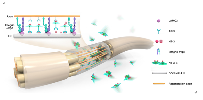 示意圖顯示: (1) PNT通道管壁上的LN或者LAMC3可以與NT-3結(jié)合,形成一種富集NT-3沉積區(qū)域,這有利于表達TrkC的基因工程雪旺細胞(NT-3-S)定植生長及其在再生軸突上形成髓鞘的生態(tài)位。(2) PNT持續(xù)分泌的NT-3可以促使表達TrkC的神經(jīng)元軸突向坐骨神經(jīng)缺損/移植處延伸,這時空可能涉及NT-3與TrkC以及LAMC3與整合素aVβ6的配體與受體相互作用。
