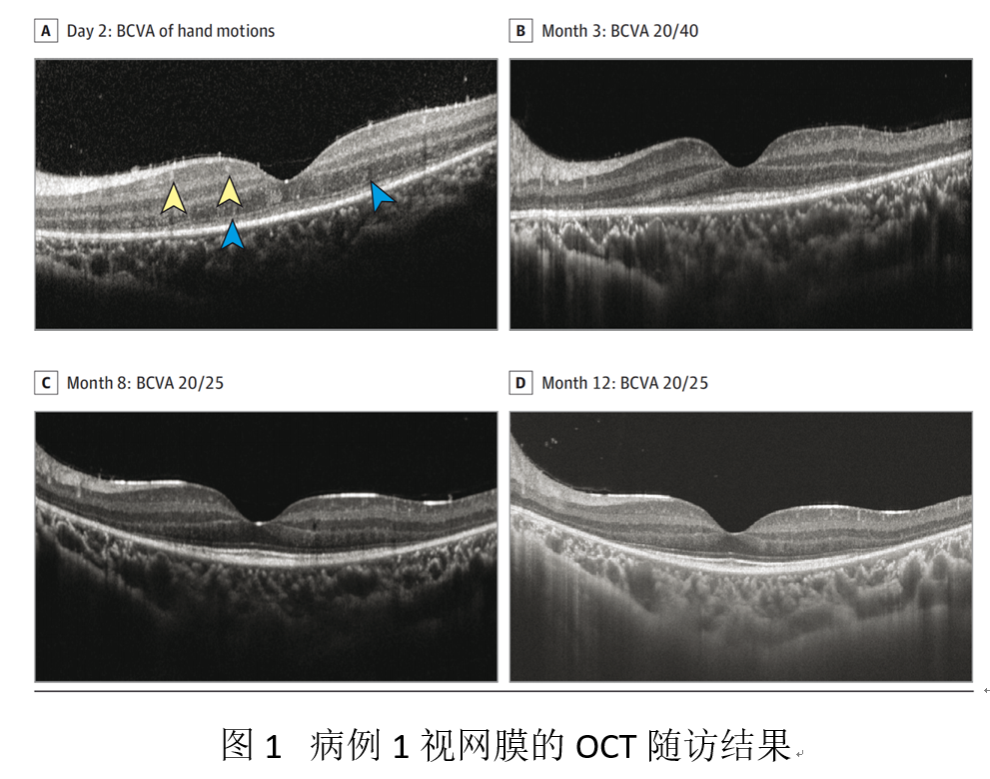 OCT顯示在疾病早期,可見ASHH征(the Angular Sign of Henle fiber layer Hyperreflectivity,一種累及Henle纖維的急性感光細胞損害的OCT征象),提示光感受器的急性廣泛損害。隨著疾病進展,中央區域的EZ和ELM逐漸恢復清晰,然而,周邊光感受器的損傷持續存在,最終形成中心凹光感受器保留的特征性表現(圖1及圖3)。
