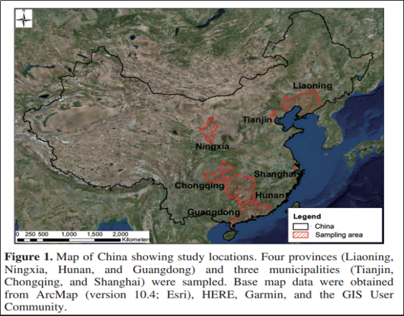 圖1. 研究地點分布圖(研究地點包括遼寧省、寧夏回族自治區(qū)、湖南省、廣東省、天津市、重慶市以及上海市)