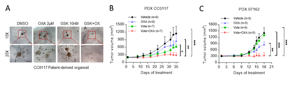 為了驗證藥物療效,研究團隊在結直腸癌細胞系、患者腫瘤來源的類器官模型及PDX模型上進行藥效實驗,證實該靶向藥物可提高奧沙利鉑療效,為臨床轉化治療提供了充足的臨床前研究數據(圖3)。