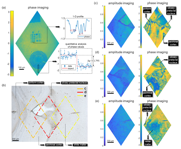 單像素復振幅成像,待測樣品為未染色鼠腦組織切片(a)相位分辨率靶成像,用于理論精度驗證;(b)顯微鏡下的染色鼠尾組織成像;(c)-(e)單像素全息系統(tǒng)在對應位置的復振幅成像。