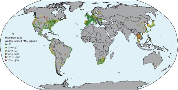 近年來,世界各地頻繁發生大規模的野外大火,造成了大量的財產損失,同時,野火產生的煙霧是細顆粒物(PM2.5)的重要來源,與城市來源的PM2.5相比,野火來源的PM2.5由于其復雜的化學成分和更小的粒徑,其毒性更強,并且往往與其他有害環境因素(如高溫)對人群健康產生共同作用,因此對人群健康有著重要影響。然而,鮮有研究系統分析和評價野火來源的PM2.5和死亡率之間的關系。為此,我校公共衛生學院陳功博副教授與澳大利亞莫納什大學公共衛生與預防醫學學院郭玉明教授及多個國家的研究團隊合作,基于全球43個國家和地區749個城市的每日全死因死亡、心血管疾病死亡和呼吸系統疾病死亡數據,利用三維化學傳輸模型GEOS-Chem評估全球野火來源PM2.5濃度(圖1),首次系統闡述了全球野火來源的PM2.5和死亡率之間的關聯。