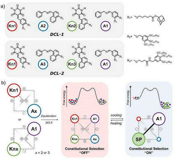 近日,我校化學學院Lehn功能材料研究所與Jean-Marie Lehn教授合作,在前期對新型C=C/C=N動態(tài)共價交換反應的研究基礎(chǔ)上(J. Am. Chem. Soc. 2018, 140, 5560; Chem. Asian J. 2021, 16, 44),以溫變后的二階超分子自組裝作為驅(qū)動力,設(shè)計構(gòu)建了具有三重動態(tài)的四組分動態(tài)組合庫(圖1)。以DCL-2為例,化合物Kn1和Kn3都能通過第一階的雙重氫鍵的自組裝形成六元超分子環(huán),而化合物Kn1結(jié)構(gòu)的金剛烷基團因位阻效應阻止其進行第二階的π-π堆積,與此同時Kn3能夠順利進行第二階自組裝形成絲狀超分子聚合物。以Kn1和Kn3的能量差為驅(qū)動力,各組分通過C=C/C=N交換反應進行含量的重新排布,最終形成以化合物Kn3主導的偏離態(tài)分布,從而獲得組分對環(huán)境溫度的選擇適應性。
