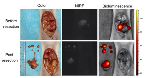 圖2:食管癌及轉移結節切除示意圖。Color:明場圖;NIRF:近紅外熒光成像;Biolumincescence:生物發光成像。