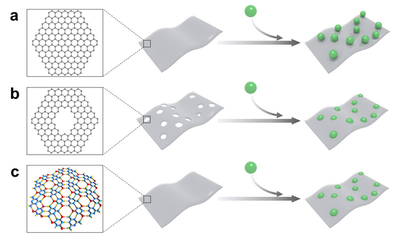 圖1. 納米顆粒與納米片的典型復合類型:(a) 納米顆粒附著于非多孔載體表面;(b) 納米顆粒鑲嵌于多孔載體上;(c) 納米顆粒鑲嵌于非多孔載體原位生成的缺陷中。分別以石墨烯、多孔石墨烯和M-CA納米片作為例子。