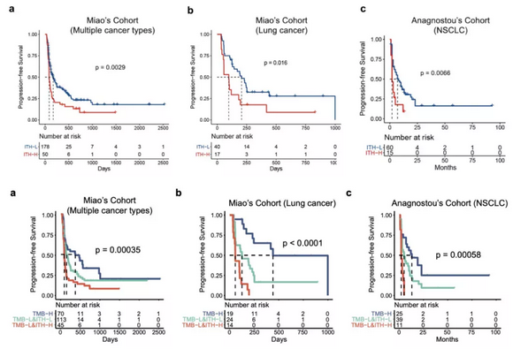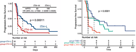 ITH-L的患者具有更長的生存期。此外,腫瘤內異質性 分布與TMB并無相關性,可認為是兩個互相獨立的指標。當聯合TMB后,腫瘤內異質性能夠在TMB-L的患者中進一步區分出療效好和療效差的兩組。