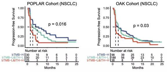 隨著腫瘤檢測技術的發展,液體活檢的重要性得到越來越多的認可,尤其是外周血循環腫瘤DNA(ctDNA)。為了探究腫瘤內異質性的預測效果能否適用于ctDNA數據,研究團隊也引入了POPLAR和OAK兩個免疫治療隊列。結果發現,發現腫瘤內異質性可從bTMB-L組有效區分出獲益人群,提示將來有望利用ctDNA檢測這種經濟、通用且無創的方法去推廣和應用 ITH,進一步降低患者負擔。