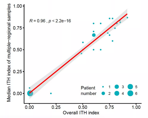 基于新算法計算的整體單次取樣腫瘤內異質性在很大程度上可代表多點取樣的 腫瘤內異質性,并且與患者多點取樣腫瘤內異質性中位值高度相關,系數達 0.96,驗證了 腫瘤內異質性分析從多點取樣向單點取樣的臨床可行性。