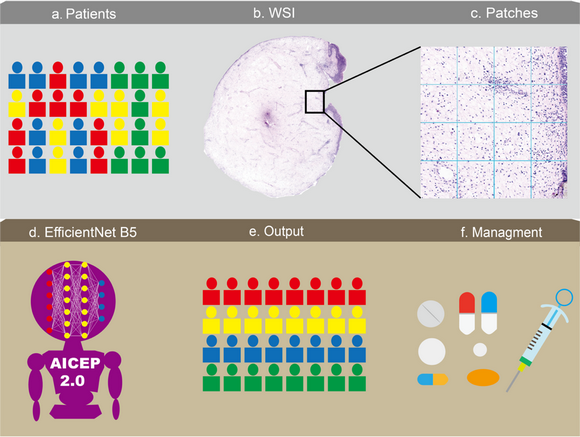四種鼻息肉細胞表型分類過程示意圖:A,四種不同表型的鼻息肉患者。B,將鼻息肉玻片通過掃描儀轉化為全玻片數字化圖像(whole-slide imagings, WSIs)。C,WSIs被自動分割成許多個pathch。D,將patches 輸入到由EfficientNet B5進行訓練的AICEP 2.0。E,AICEP 2.0輸出鼻息肉四種細胞表型的結果。F,針對不同鼻息肉細胞表型給予個體化治療。