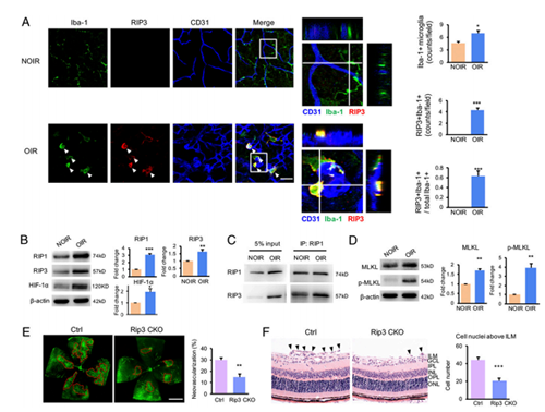 圖一 Rip1/Rip3高表達的小膠質細胞發生程序性壞死促進視網膜新生血管形成