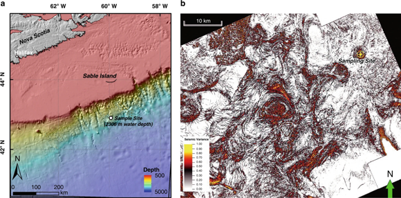 為了回答這一問題,研究團(tuán)隊選擇位于大西洋西北部的Scotian盆地作為研究對象。Scotian盆地地處加拿大東部的新斯科舍省近海,為火山和非火山過渡大陸邊緣,延伸約260,000平方公里的面積。通過地球物理分析,首次在該區(qū)域發(fā)現(xiàn)與鹽構(gòu)造有關(guān)的冷泉。通過對沉積物樣品進(jìn)行地球化學(xué)分析,表明氣體類型為由成熟的烴源巖向上運移的熱成因氣體。研究團(tuán)隊進(jìn)一步借助整合宏組學(xué)手段,對沉積物柱的不同深度樣品進(jìn)行微生物群落解析,獲得兩個重要發(fā)現(xiàn):(1)沉積物中的微生物正在降解熱成因烴,而且古菌和細(xì)菌各司其職;(2)乙烷和丁烷的厭氧古菌降解不一定和硫酸鹽還原耦合。