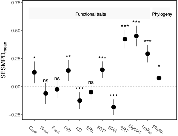 圖1. 根系群落中共存物種性狀和譜系的分布格局