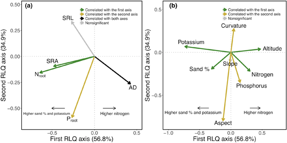 收斂的性狀主要受土壤鉀-氮梯度的影響:分布在含砂量較高土壤中的物種具有較小的根直徑和較高的根系氮濃度;分布在含氮量較高土壤中的物種通常具有較大的根直徑;同時,性狀的分布也受坡向和土壤有效磷的影響,使根系性狀沿環境變異表現出多維性狀適應策略:根系形態和化學性狀通常相互獨立變化,組合成多樣的性狀特征應對土壤異質性(圖2)。