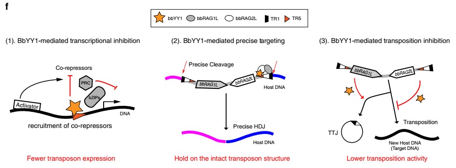 發現ProtoRAG 轉座子后,一個重要的科學問題一直懸而未解。活躍的轉座子在宿主基因組中移動跳躍,可影響基因組穩定性,從而對宿主產生危害。已發現的高等脊椎動物RAG系統基本都丟失了轉座子特征和體內的轉座活性。那么,文昌魚基因組中的ProtoRAG是如何維持其轉座子特征,卻又不對宿主基因組產生嚴重危害呢?