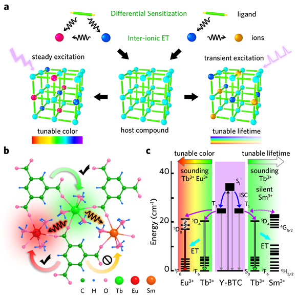 圖1. (a) 光色/壽命可調(diào)鑭系配位聚合物的設(shè)計(jì)策略; (b) Y-BTC的配位環(huán)境及配體向鑭系離子、鑭系離子間的能量傳遞示意; (c) 鑭系離子激活的Y-BTC體系中配體與鑭系離子的能級(jí)圖示意。