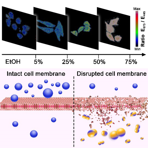 實驗表明,Pt1的細胞攝取量與細胞膜完整性呈線性關系。利用不同濃度的乙醇孵育,我們構建了細胞膜受損的生物模型。在乙醇或非乙醇處理的細胞中,Pt1的藍色發光強度均保持不變;而在細胞膜受損模型中,黃色發射強度呈乙醇濃度依賴性,因此黃色發射與藍色發射的比值可以反映細胞膜的損傷程度。