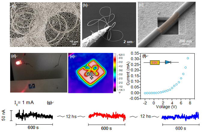 (d) 單根納米電纜在300℃左右帶動紅色發光二極管工作;(e) 器件襯底的紅外熱成像;