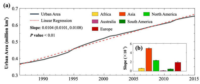 圖1. 全球和各大洲1985-2015年間城市面積變化情況:(a)全球城市面積變化趨勢(shì),