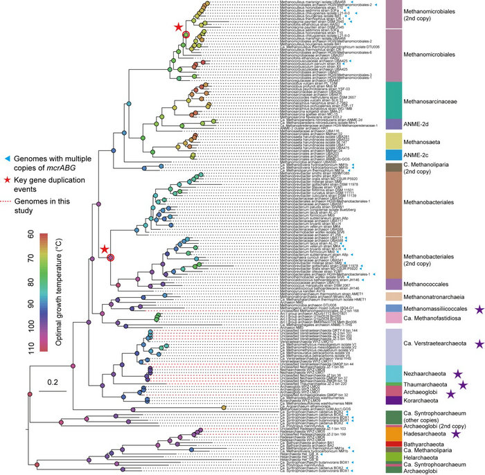 近期,我校生命科學學院李文均教授課題組在國際知名學術期刊Nature Communications發(fā)表題為“Insights into ecological roles and evolution of methyl coenzyme M reductase containing hot spring Archaea”的學術論文。研究表明:滇藏熱泉生態(tài)系統(tǒng)中蘊含著豐富的微生物資源,包含大量的系統(tǒng)發(fā)育位置未知且功能奇特的神秘、新穎的微生物類群。課題組結(jié)合宏基因組學測序技術和生物信息學手段從中重構(gòu)出14個具有甲烷/烷烴代謝能力的微生物基因組(圖1),其系統(tǒng)發(fā)育多樣性極高且獨特,廣泛分布于韋斯特古菌門、哪吒古菌門(Nezharchaeota)等TACK超級門中。值得一提的是,該課題組首次于奇古菌門(Thaumarchaeota)中發(fā)現(xiàn)其具有產(chǎn)甲烷功能。此前,奇古菌門以其好氧氨氧化能力而為眾人所熟知,而課題組首次對其厭氧狀態(tài)下產(chǎn)甲烷能力的發(fā)現(xiàn)表明我們目前對此門認知的局限性,神秘的自然界或?qū)⑦h遠超出我們的認知。此外,組學技術的發(fā)展或?qū)⒅敢覀儗ζ溥M化歷史進行更全面的認知。課題組對這些未知生命的代謝特征進行了揭示,并發(fā)現(xiàn)除卻傳統(tǒng)的氫營養(yǎng)型產(chǎn)甲烷菌外,還有多種氫依賴的甲基營養(yǎng)性產(chǎn)甲烷菌,他們可吸收熱泉生態(tài)系統(tǒng)中多種甲基底物以完成甲烷的產(chǎn)生(圖2)。通過進化基因組分析,課題組還對古菌祖先的進化起源進行了推測,研究發(fā)現(xiàn)對于具有產(chǎn)甲烷能力的微生物類群,其甲烷代謝關鍵基因mcrABG相對較為保守,并無明顯的水平基因轉(zhuǎn)移時間發(fā)生;而對于烷烴氧化的微生物類群,水平基因轉(zhuǎn)移對其多樣性塑造有著深遠影響。基于甲烷代謝基因的保守性,課題組對其祖先序列進行了序列重構(gòu),從而來推測祖先序列的最適生長溫度,結(jié)果表明具有mcrABG標記基因的微生物類群或起源于高溫生境(圖3)。另外,由于 TACK和ASGARD超級門中,以及廣古菌門中大部分支系均具有甲烷/烷烴代謝能力,且相應微生物相比其它同支系微生物有著更為悠久的進化歷史(圖1),因此,課題組猜測地球早期生命中,古菌的祖先或具有甲烷和烷烴代謝能力。
