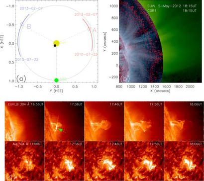 圖4:不同視角對同一暗條爆發的觀測,可以看出暗條爆發過程中的旋轉