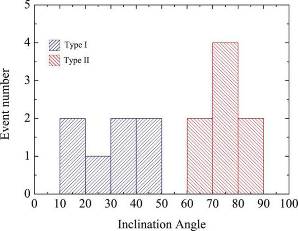 圖2:兩類束縛耀斑中耀斑后環的傾斜角分布