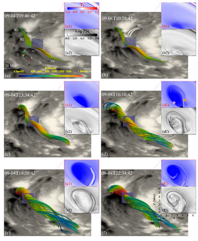 以往研究認為,太陽大氣中磁繩的形成機制有兩種:一種為從太陽內部整體浮現;另一種是在太陽大氣中直接形成。大氣科學學院劉麗娟副研究員及合作者通過研究一個耀斑以及日冕物質拋射頻發的浮現活動區(NOAA編號12192)中磁繩的演化,發現即使在活動區浮現初期,其中的磁繩也不是從太陽內部整體浮現的,而是通過屬于不同偶極且極性相反的磁極的碰撞所引發的磁對消和剪切形成的,碰撞由不同偶極在浮現中的自然分離引起。這一發現揭示了磁繩在太陽大氣中的形成也由太陽內部磁通的浮現驅動。