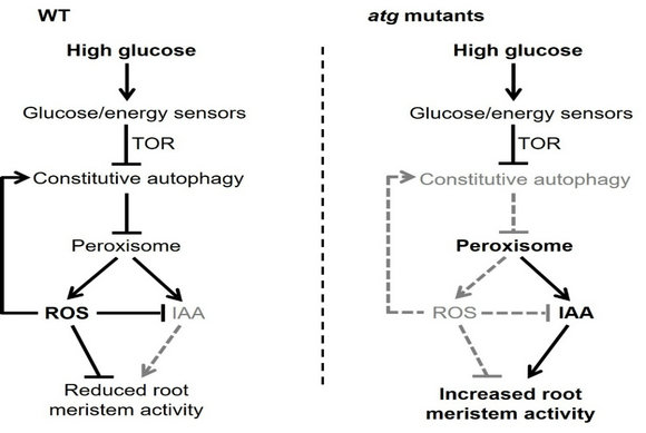 圖2:自噬調(diào)控葡萄糖介導(dǎo)的根分生組織活性的工作模型