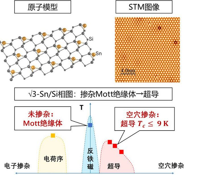 圖2:硅(111)表面1/3單層的錫原子構成的稀疏三角晶格結構:Sn/Si(111)-(?3×?3)R30o。STM圖像顯示這一結構在摻雜后仍高度均勻。相圖顯示類似于銅氧化物高溫超導體的特性:通過摻雜摩特絕緣體獲得超導性。