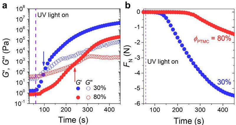 圖2. PPF-co-PTMC多嵌段共聚物的原位光流變測試(a)儲能模量G'和損耗模量G'';(b)收縮應力FN