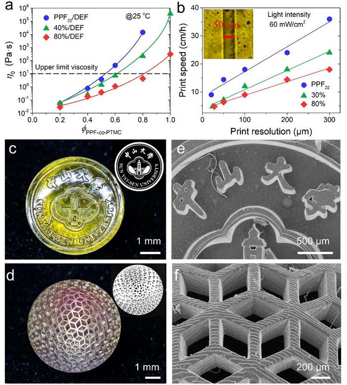 圖3. PPF-co-PTMC多嵌段共聚物鏈結構與(a)流變性能及(b)光固化打印速度間關系。(c-f)二維中山大學校徽圖案與三維空心菱形球體結構的高分辨率打印。