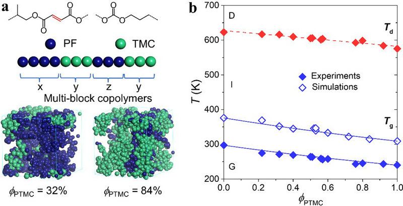 圖1.(a)富馬酸丙二醇酯(PF)和三亞甲基碳酸酯(TMC),以及PPF-co-PTMC多嵌段共聚物的化學結構示意圖。(b)PPF-co-PTMC多嵌段共聚物鏈結構與熱學性能關系。