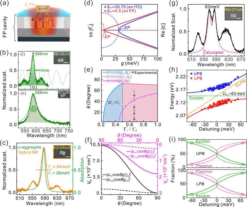 圖 1. (a) 介質(zhì)微腔剪裁金屬等離激元模示意圖;(b) 單個(gè)Au@Ag NR在(i)F-P腔和(ii)ITO襯底上的暗場(chǎng)散射譜;(c) J-aggregate的吸收譜和單個(gè)Au@Ag NR在F-P腔的散射譜;(d) 耦合系統(tǒng)在F-P腔和ITO襯底上的奇異點(diǎn)處的臨界耦合強(qiáng)度;(e) 在吸收和輻射強(qiáng)耦合臨界條件下,所允許激子偶極矩偏離最強(qiáng)電場(chǎng)的最大角度作為激子線寬與等離激元線寬比值的函數(shù);(f) 在吸收和輻射強(qiáng)耦合臨界條件下,有腔和無(wú)腔設(shè)計(jì)時(shí)所允許的Au@Ag NR最大模體積作為角度的函數(shù);(g) 共振情況下腔剪裁的單個(gè)Au@Ag NR@J-aggregate雜化系統(tǒng)的暗場(chǎng)散射測(cè)量結(jié)果;(h) 實(shí)驗(yàn)數(shù)據(jù)(點(diǎn)圖)及理論計(jì)算(線圖)得到的雜化系統(tǒng)色散關(guān)系;(i) 色散關(guān)系上支(UPB)與下支(LPB)中的等離激元模式、J-aggregate激子的相對(duì)占比。