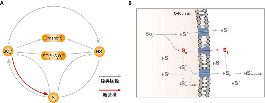 圖1. 異化硫酸鹽還原產生零價態硫:A. 微生物介導的硫循環與異化硫酸鹽還原產零價態硫(S0)新途徑;B. 異化硫酸鹽還原產物。