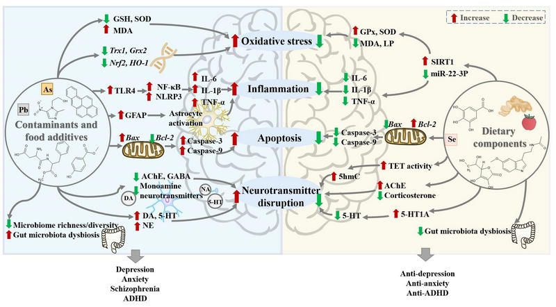該文對多種污染物,如重金屬(鉛、砷)、有機污染物(多氯聯(lián)苯、多環(huán)芳烴和苯并芘)、抗生素(米諾環(huán)素、環(huán)丙沙星、甲硝唑)、農藥(氯氰菊酯、敵敵畏和氯氰菊酯),及食品添加劑,如阿斯巴甜、對羥基苯甲酸酯、聚山梨醇酯和味精等,進行了總結。闡述了污染物及食品添加劑會增加精神障礙的風險,例如抑郁癥、焦慮癥、精神分裂癥、注意力缺陷多動障礙。另一方面,一些天然膳食產物,如蘋果提取物、抗壞血酸、沒食子酸、褪黑素、姜黃素和益生菌等能夠防治污染物和食品添加劑引發(fā)的心理疾病,該文強調了污染物和食品添加劑對心理健康的影響,而不是傳統(tǒng)上認為的對機體健康的影響。