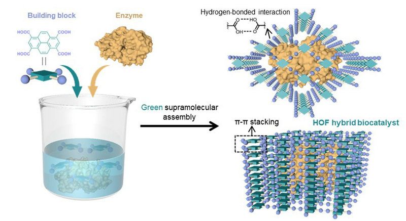 中大新聞網(wǎng)訊(通訊員黃維)天然酶是一類(lèi)具有催化活性的天然聚合物,通過(guò)綠色、溫和、高效的方式催化細(xì)胞內(nèi)的生物化學(xué)反應(yīng),具有人工催化劑無(wú)法比擬的高效率。然而,酶的柔性構(gòu)象在外界刺激下極易發(fā)生變化,極大地限制了酶的大規(guī)模工業(yè)應(yīng)用。利用多孔超分子“盔甲”對(duì)天然酶結(jié)構(gòu)進(jìn)行約束、保護(hù)是設(shè)計(jì)多功能雜化生物催化劑的有效手段,既能解決酶的穩(wěn)定性問(wèn)題,又能提高酶的可重復(fù)性。盡管該領(lǐng)域已取得了系列進(jìn)展,但多孔超分子框架的結(jié)晶往往需要苛刻的條件,如何實(shí)現(xiàn)在生物相容條件下原位裝配超分子晶體“盔甲”仍是技術(shù)難點(diǎn)。